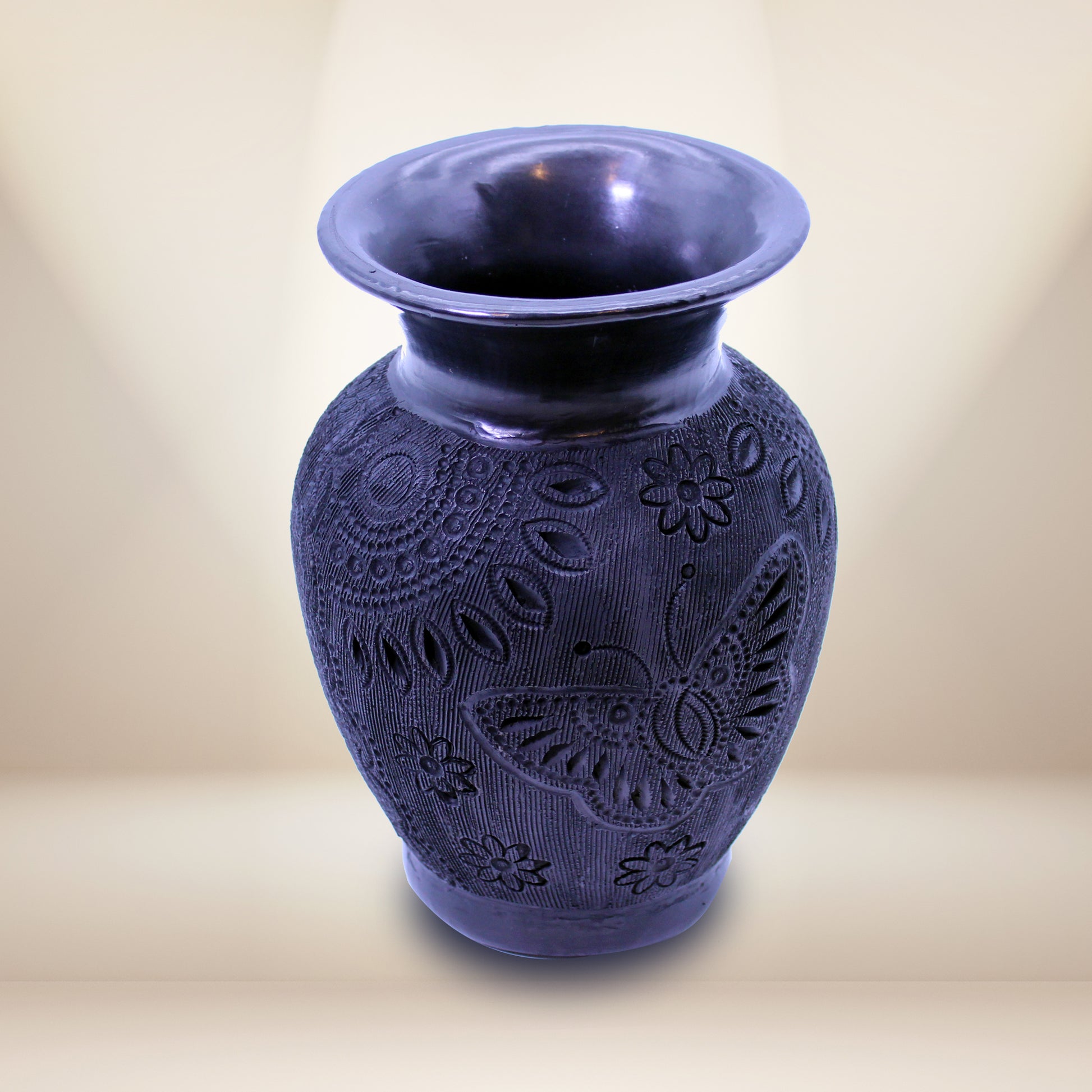 Hand-Carved Black Clay Vase - Flowers & Butterflies Design
