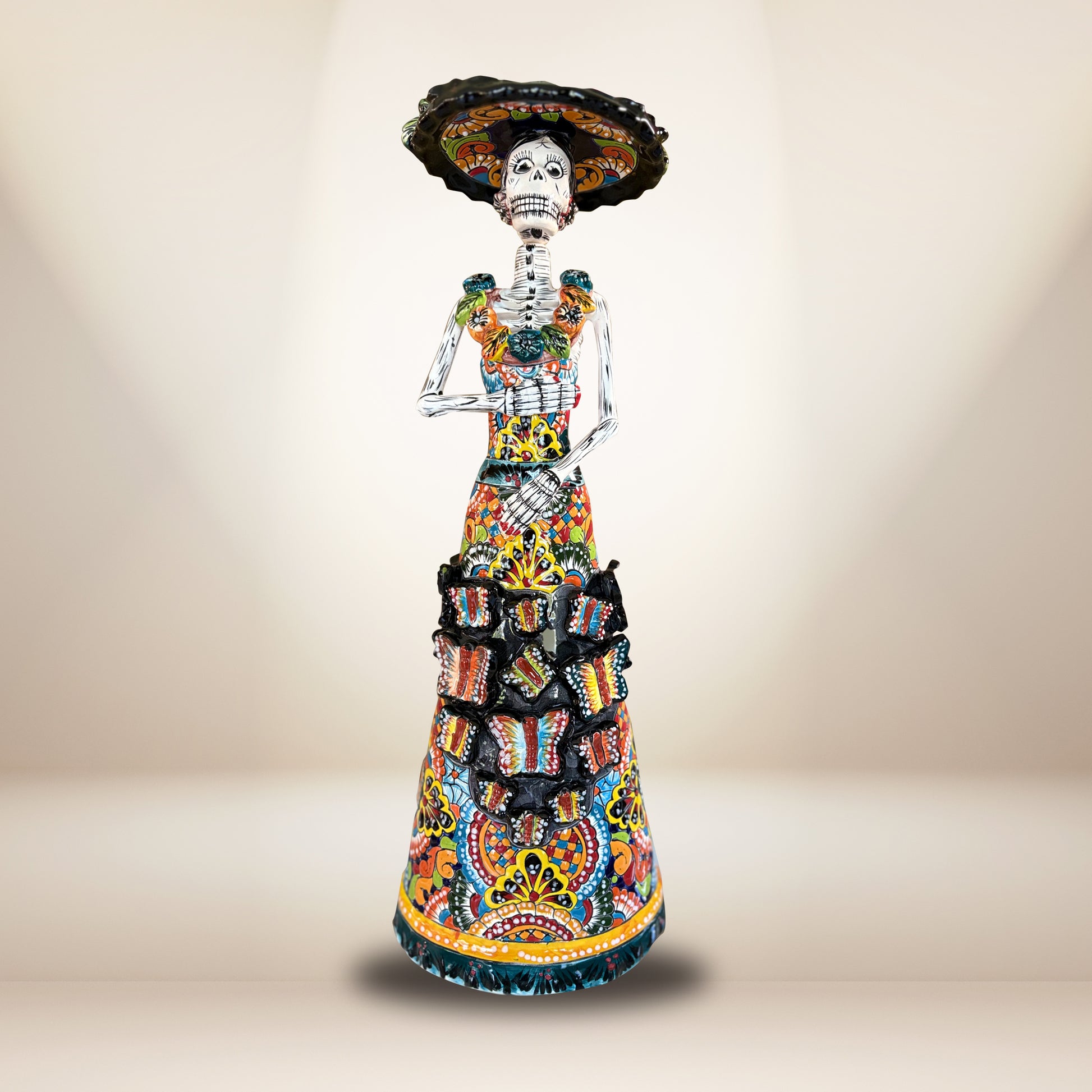 Colorful ceramic figures in the shape of "Catrina with mini butterflies" seasonal.