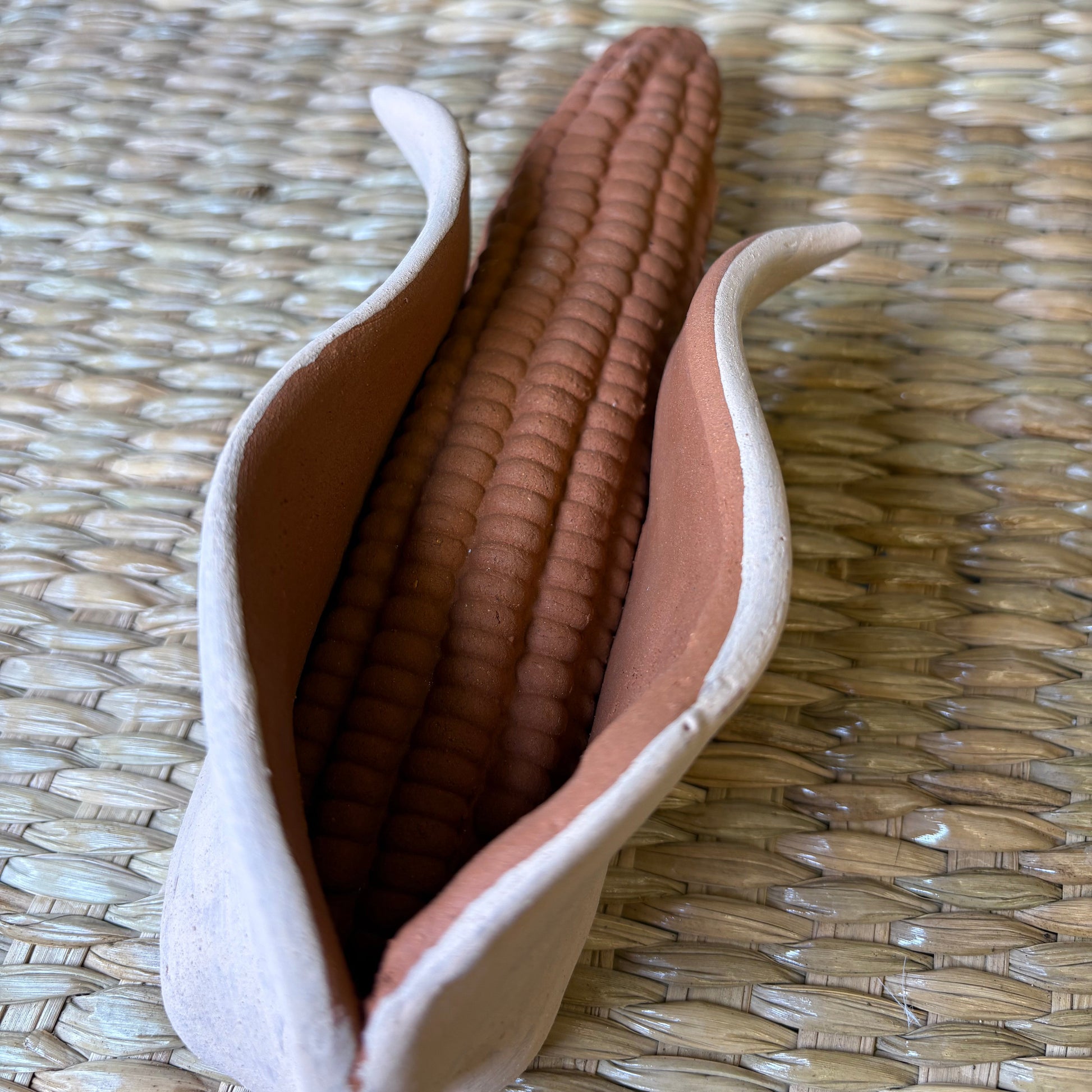 100% handmade clay. Featuress a detailed, brown corn-on-the-cob with husk-shaped. Size Large