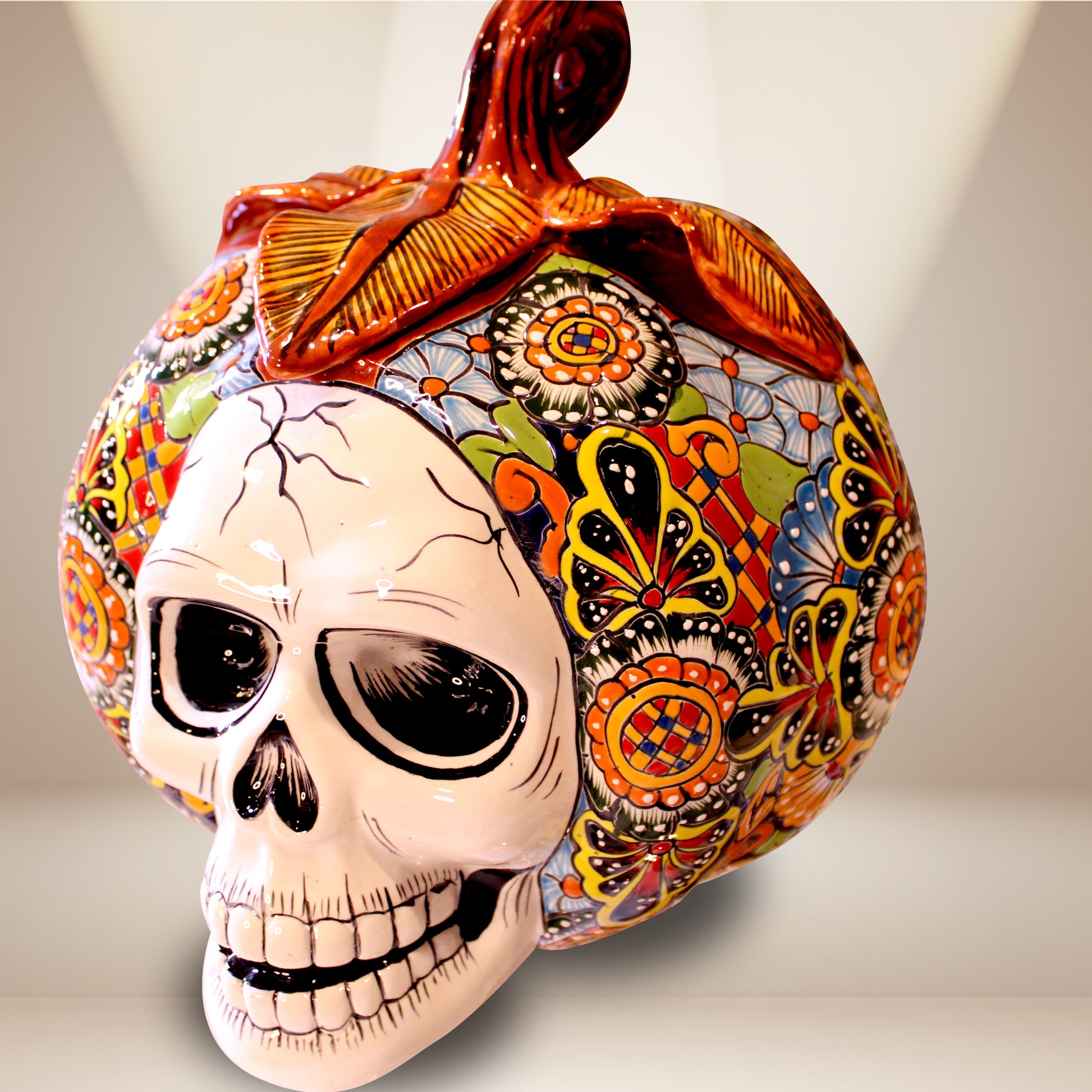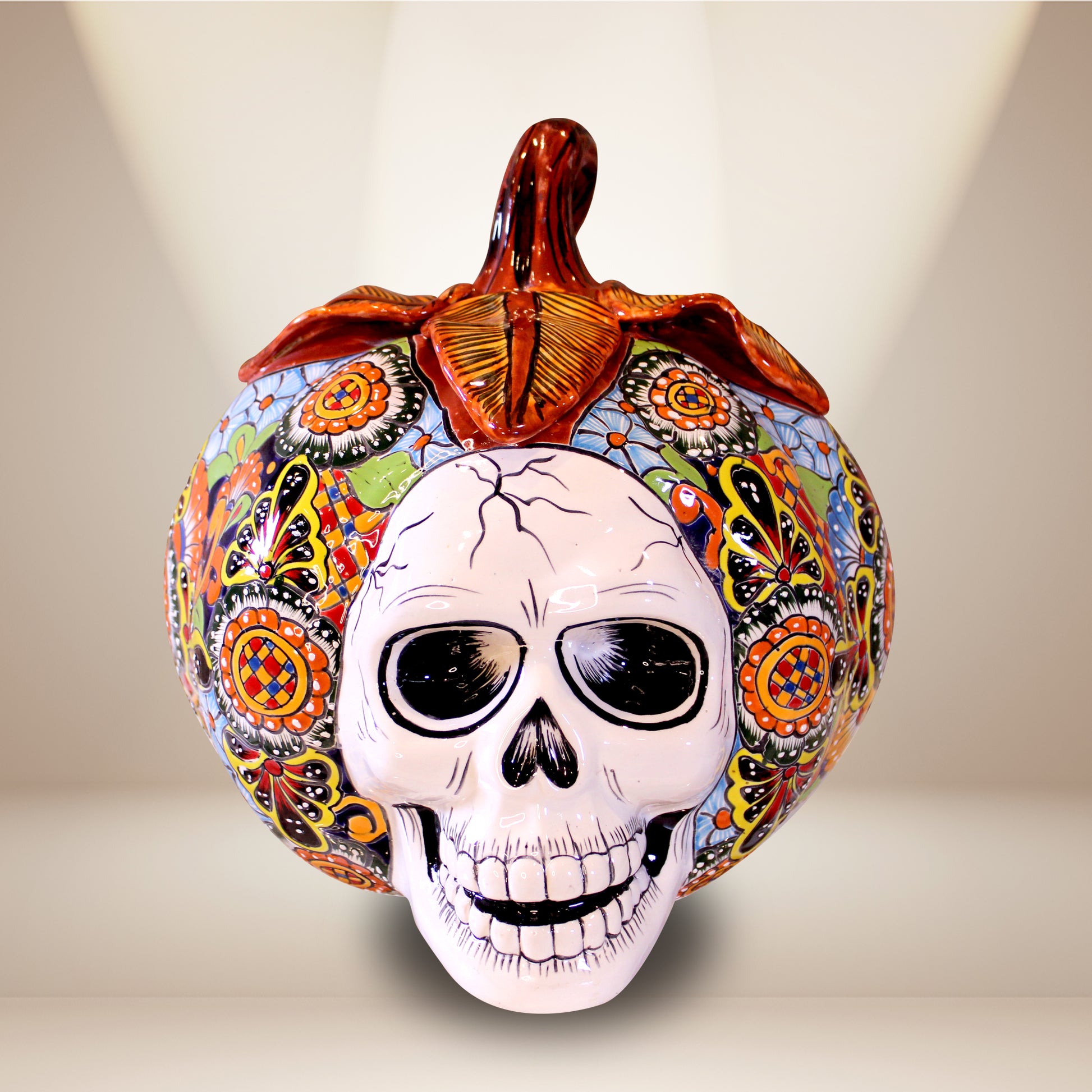 Colorful ceramic figures in the shape of "Skull pumpkin" seasonal.